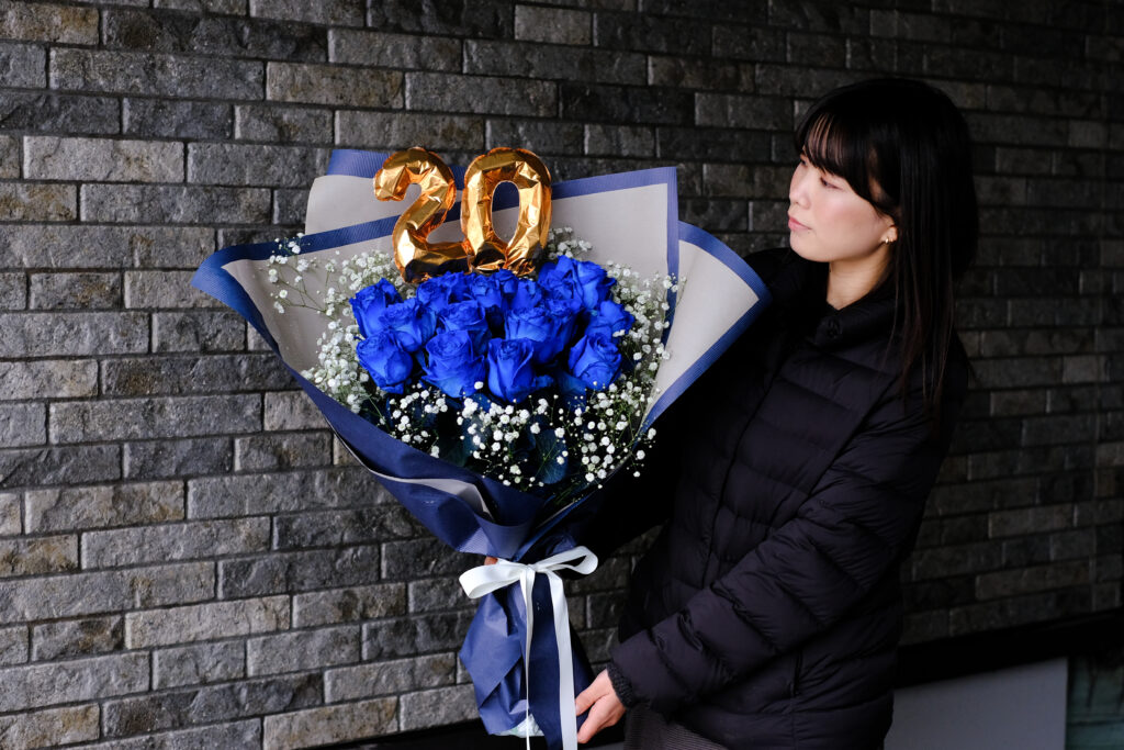 二十歳の集いにちなみ、20本のバラやガーベラでご用意する花束はとてもインパクトもあり